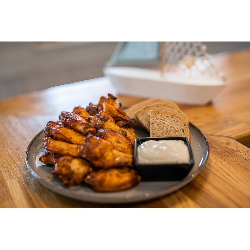 Grilovaná kuřecí křidélka, chléb, bylinkový dip