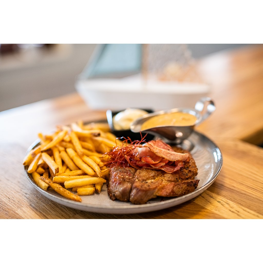 pepřová omáčka Steak z krkovice, hranolky, okurky, česneková mayo, slanina